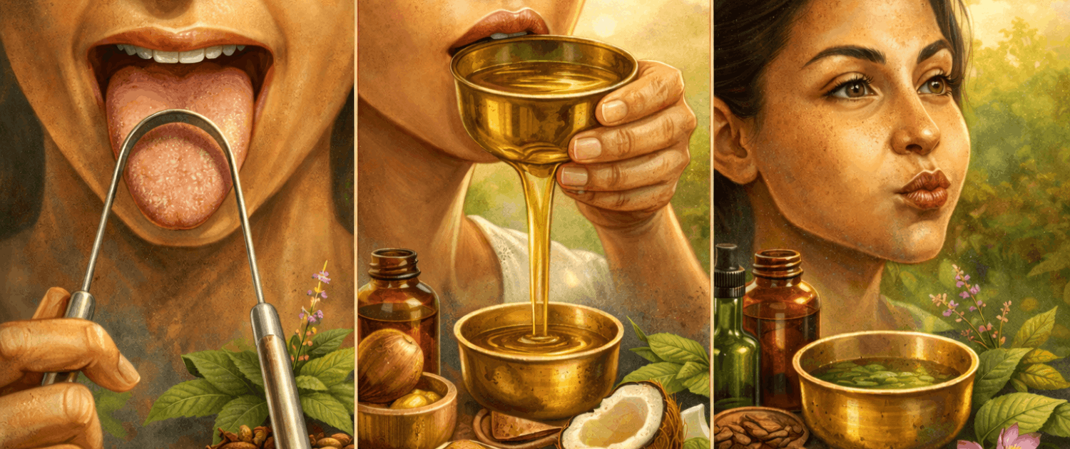 Tongue Scraping, Oil Pulling, Herbal Mouth Rinses, Ghee Holding, Chewing Herbs, using Ayurvedic Herbal powders or Churna drinking warm are all apart of the sequence to maintain a balanced oral microbiome, strengthening gums and removing toxins through natural plant medicine remedies.