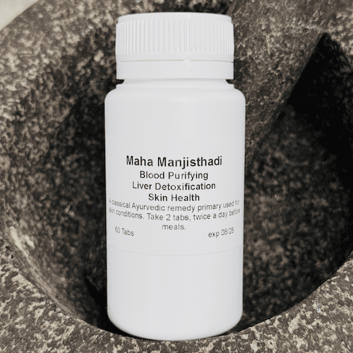 Maha Manjisthadi is considered a blood purifier, specifically used in Ayurveda to clean, cool and clear the blood of all excess pitta, heat, inflammation and toxins. Considered helpful for itching in eczema, psoriasis, dermatitis, acne, acne rosacea, tinea pedis and herpes. A pitta pacifying diet is recommended while taking Maha Manjisthadi.
